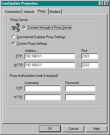 Enter your proxy server information as shown above (replacing the 192.168.0.1 IP addresses with the Internal IP address of the machine you run SpoonProxy on . Note that these are the default port settings for SpoonProxy so no configuration of the proxy itself is necessary to make Live Update work.