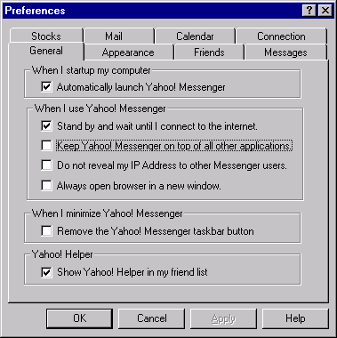From the main Yahoo Messenger Window, select Edit >> Preferences which will bring up the following screen: